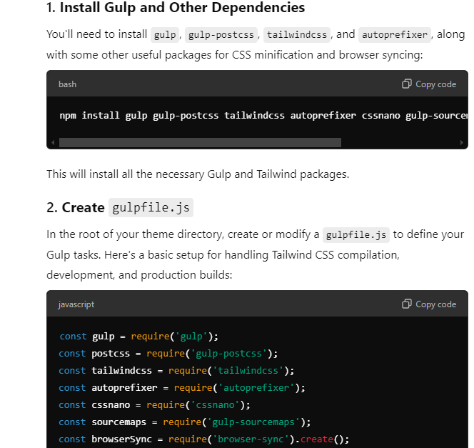 npm install gulp gulp-postcss tailwindcss autoprefixer cssnano gulp-sourcemaps gulp-concat browser-sync